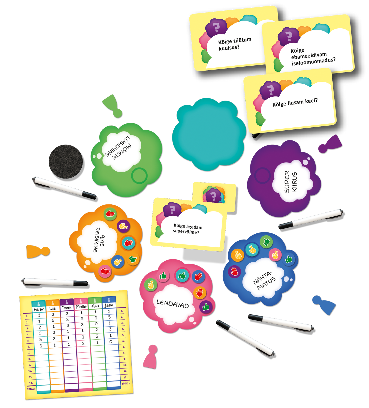 Karbis: Tulemuste tabel, 300 küsimuskaarti, 6 mängualust, svamm, 6 markerit, 18 sümboliga mängumärki ja 6 mängunuppu.