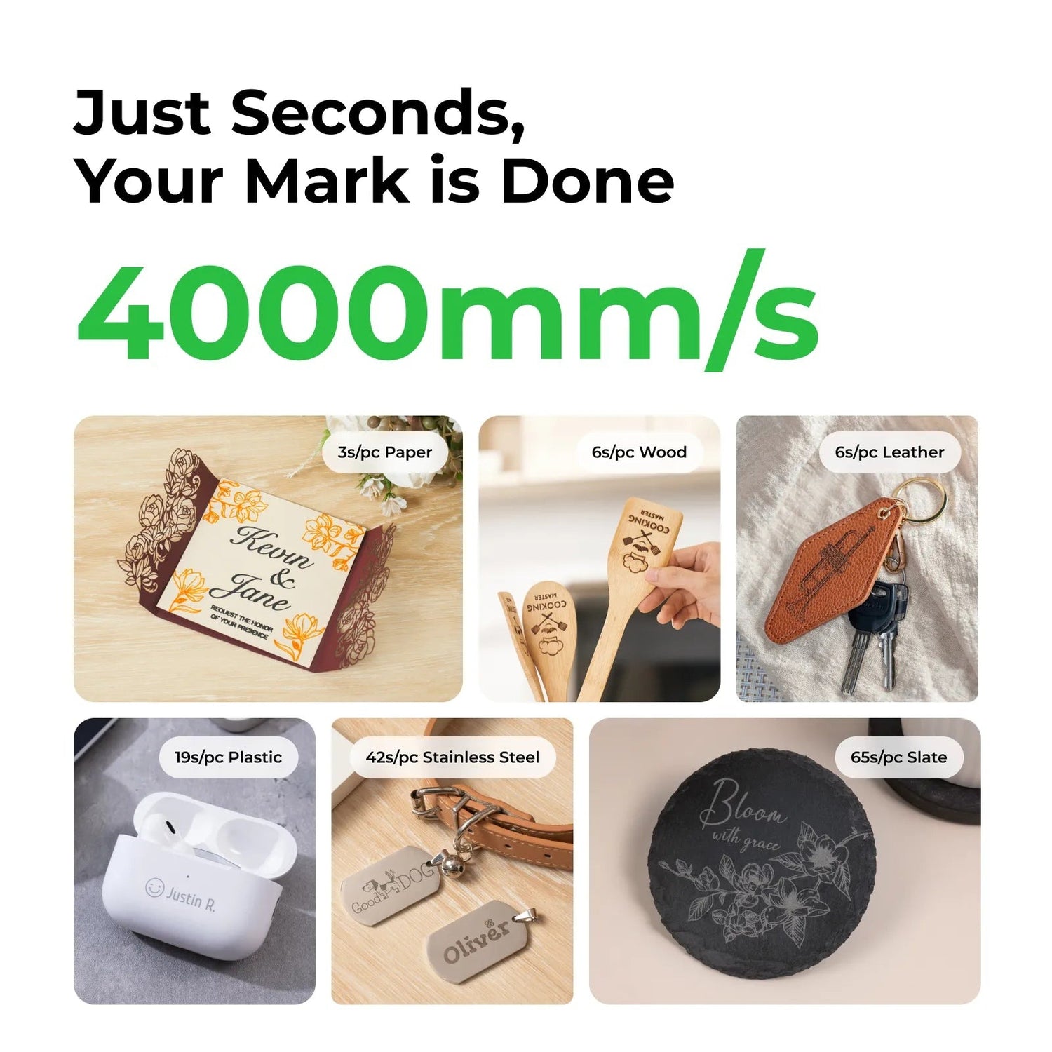* Ülikiire graveerimine. Graveerimiskiirus kuni 4000 mm/s võimaldab lõpetada keerukaid projekte sekunditega, näiteks metallist visiitkaardi graveerimine võtab vaid 5 sekundit.