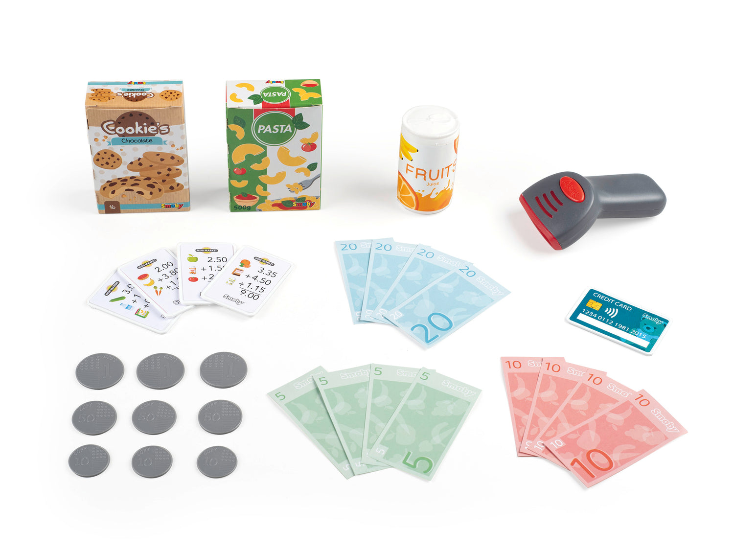 Kaasas 30 tarvikut: 1 heli ja valgusega skanner, 1 purk õunamahla, 2 karpi (küpsised/pasta), 4 kviitungit, 12 paberraha, 9 münti ja 1 krediitkaart.