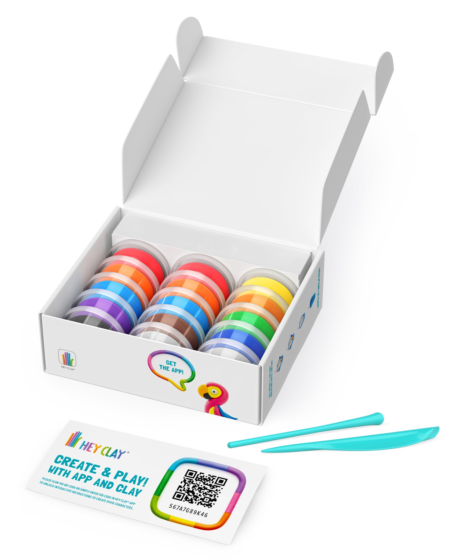 Mitmevärviline viieteist topsiga voolimismassi komplekt. Ärata lõbusad tegelaskujud interaktiivse äpiga ellu.