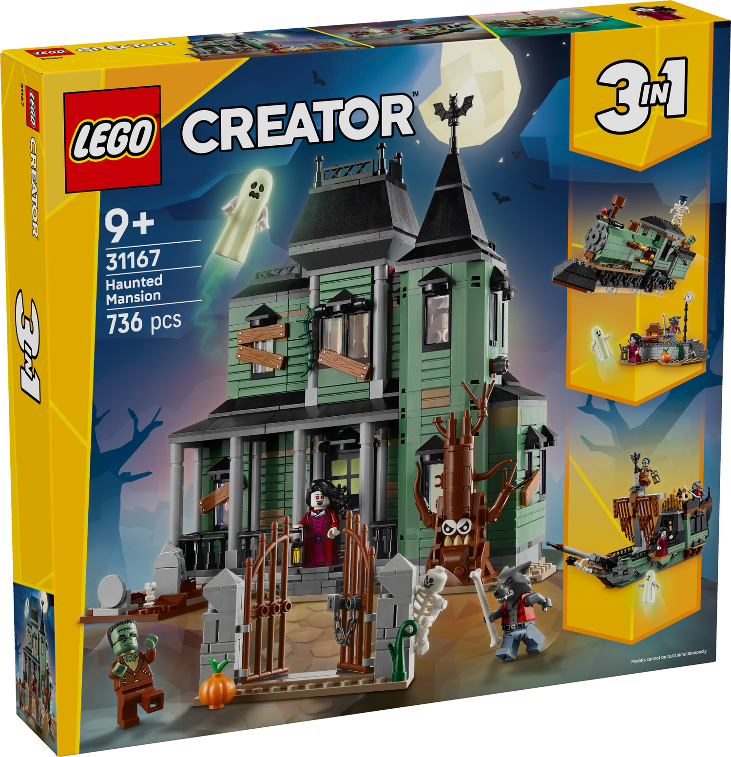 Lapsed saavad LEGO® Creator kolm-ühes kummitava häärberi mänguasjaga hirmutavaid tegevusi etendada. Maja saab ümber ehitada kummituslaevaks või -rongiks.