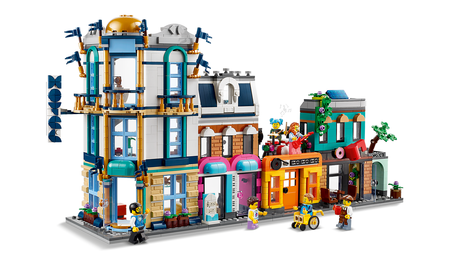 • Lõputud mänguvõimalused – LEGO® fännid saavad ehitada ja ümber ehitada kolm erinevat linnapilti: tänav hotelli, muusikapoe, plaadipoe ja kohvikuga; neljakorruseline art deco stiilis korterelamu või kaarkäiguga turutänav.