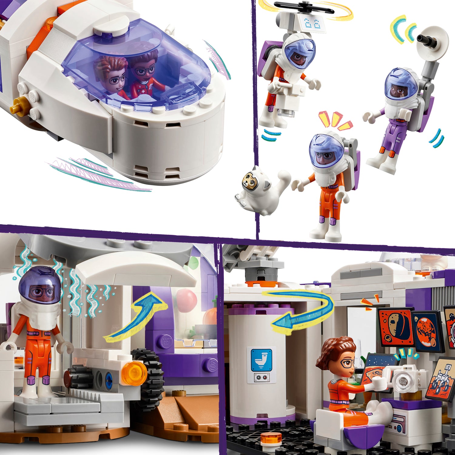 Lastele mõeldud LEGO® Friends Marsi kosmosebaasi ja raketi ehitusmänguasjaga on kaasas kokkupandav rakett, uurimiskulgur, uurimisbaas ja neli tegelaskuju.