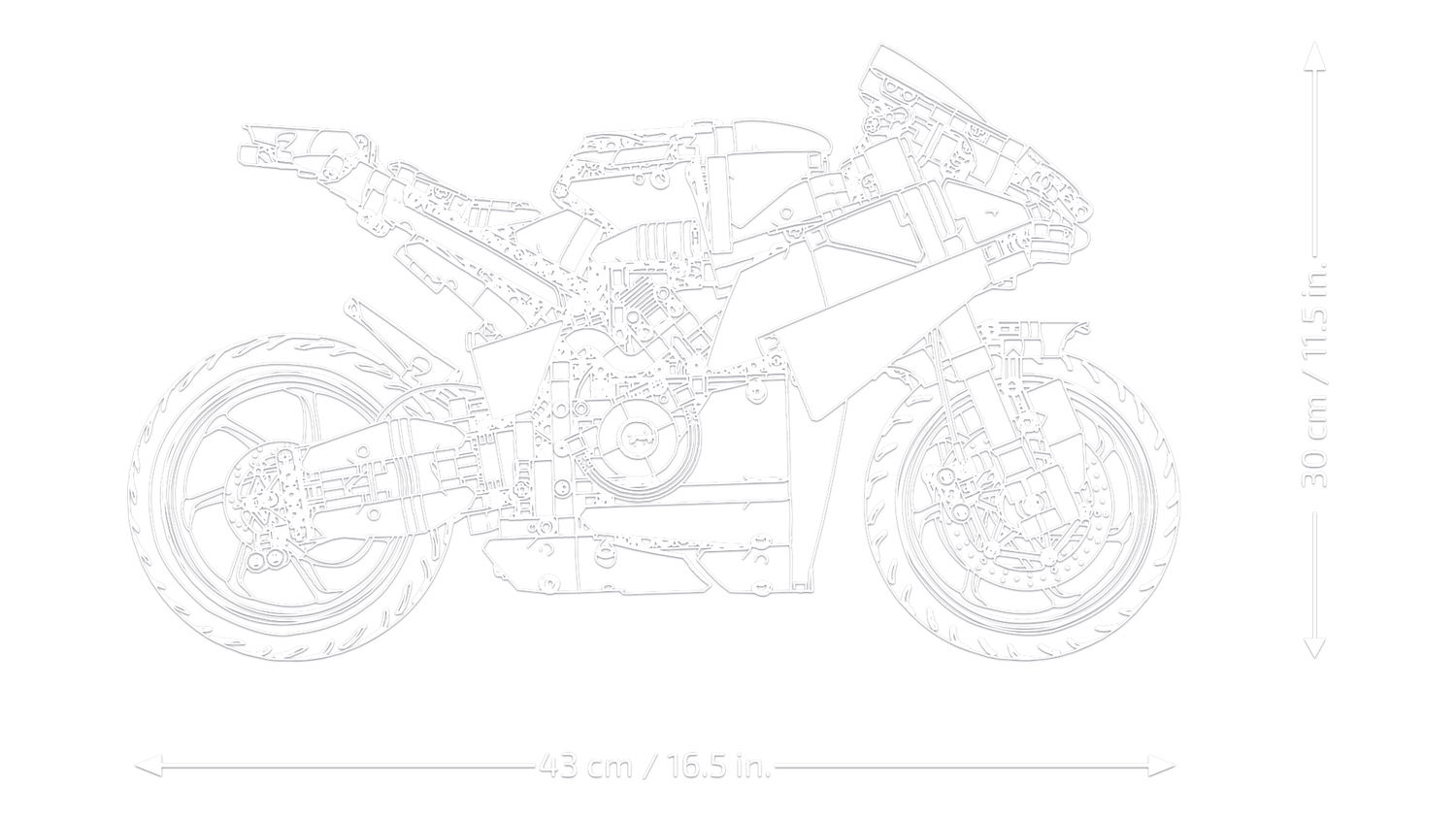 • Measurements – A 1,603-piece set with a LEGO® motorcycle vehicle model measuring over 30 cm (11.5 in.) high, 43 cm (16.5 in.) long and 15 cm (5.5 in.) wide