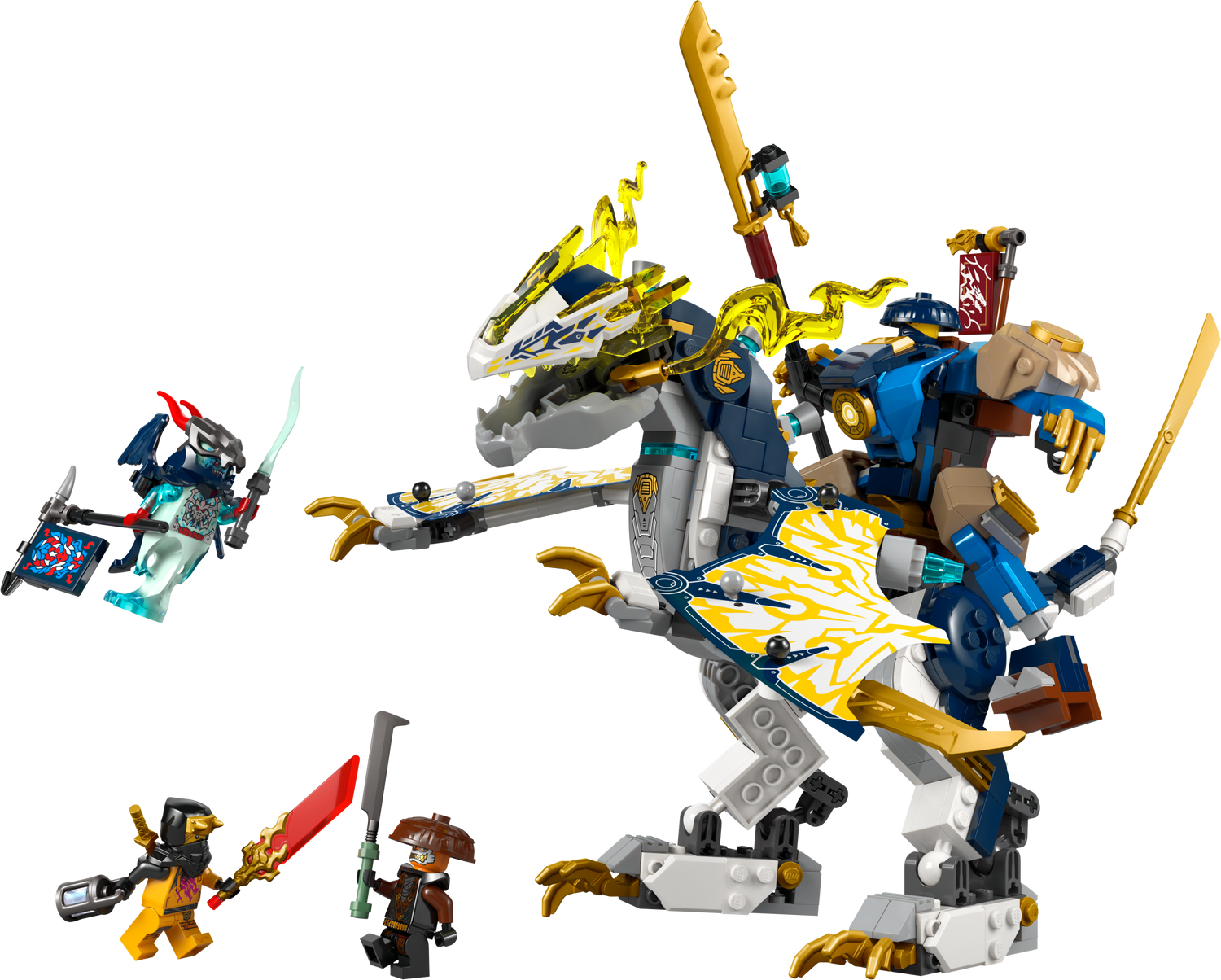 LEGO® NINJAGO® ehituskomplekt draakonimänguasja, roboti ja 4 minifiguuriga võimaldab lastel etendada lugusid telesarja NINJAGO Dragons Rising 3. hooajast.
