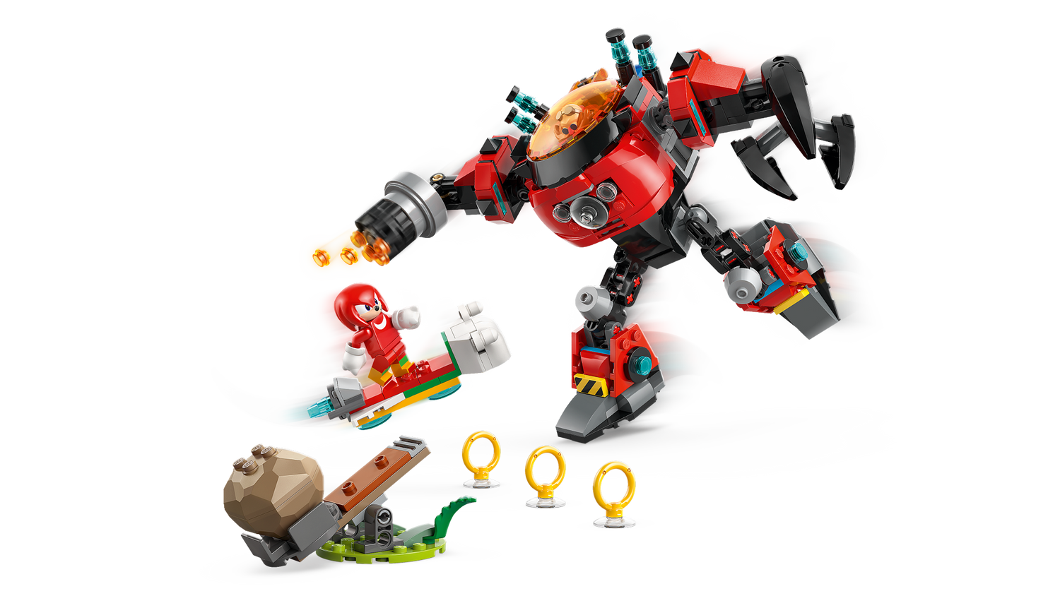 Vaimusta LEGO® Sonic the Hedgehog™ fänne selle Knuckles vs. Dr. Eggman Egg Crusher roboti mängukomplektiga, mis sisaldab muudetava asendiga robotit, katapulti ja 2 tegelast.