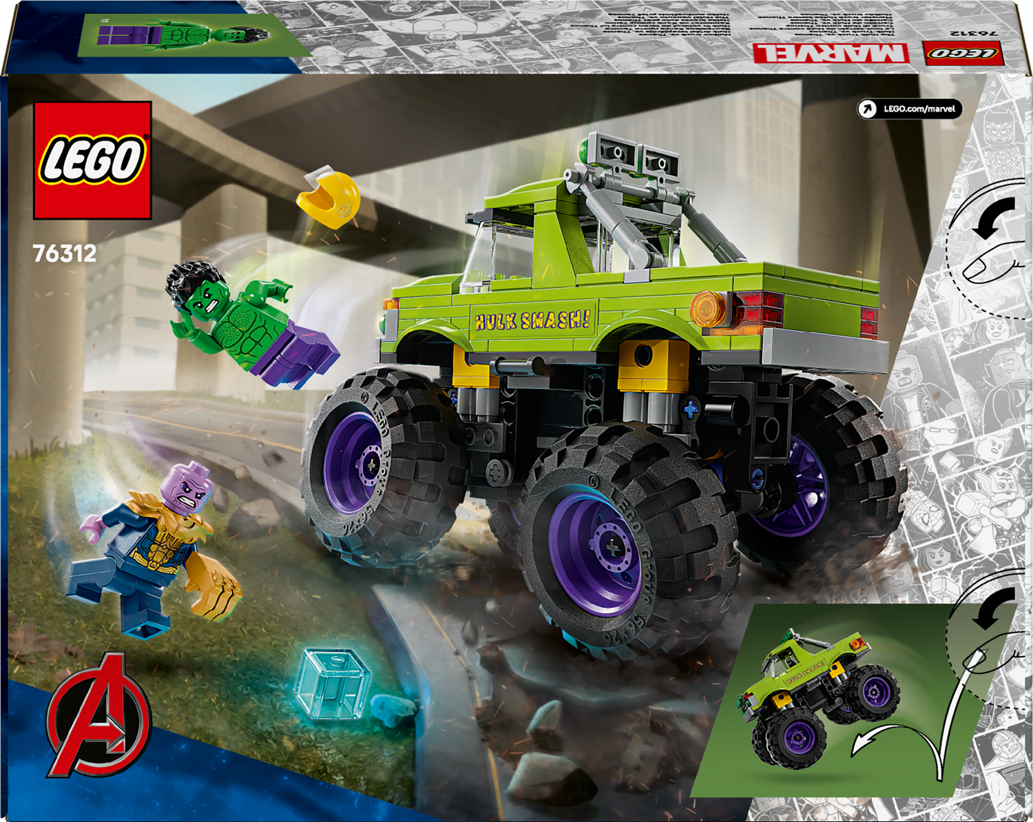 Hulki veoauto vs. Thanos (76312) on kokkupandav LEGO® ǀ Marveli mängukomplekt, mis sisaldab Hulki raskeveokit ja kahte superkangelase minifiguuri.