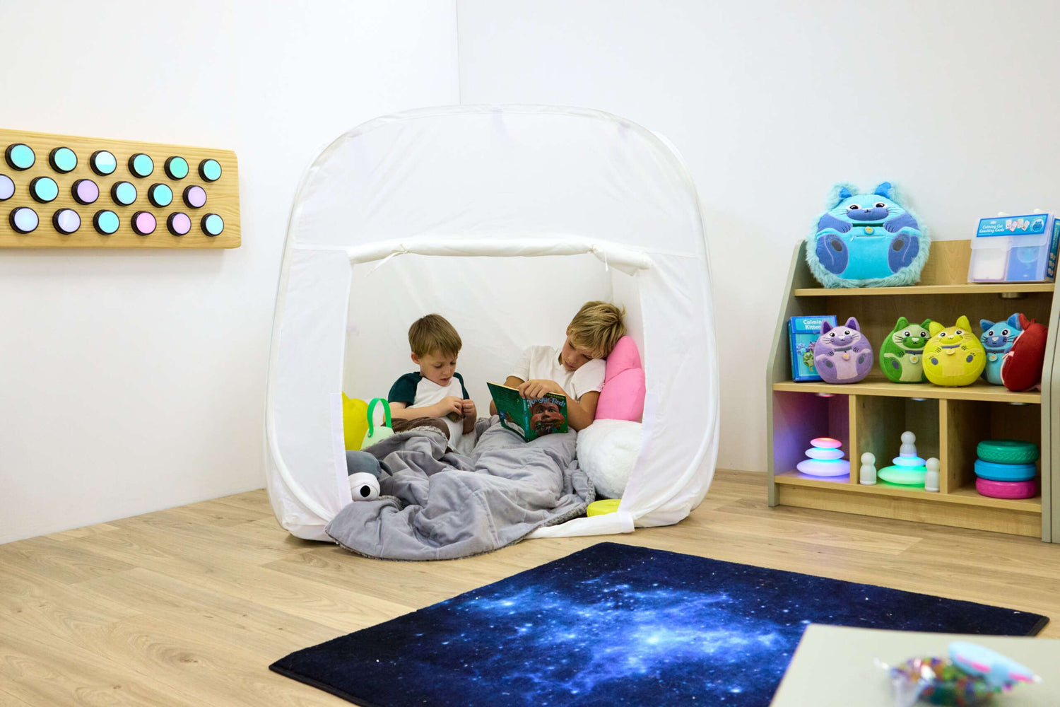 TTS valge kokkupandav mini aistingutelk on kompaktne pesa rahunemiseks ja keskendumiseks. Telk avaneb kiiresti ja liigub hõlpsalt ruumist ruumi. Sees olevad takjakinnitused aitavad lisada valguseid või sensoorseid vahendeid. Sobib alates 10. elukuust lasteaeda ja alusharidusse.